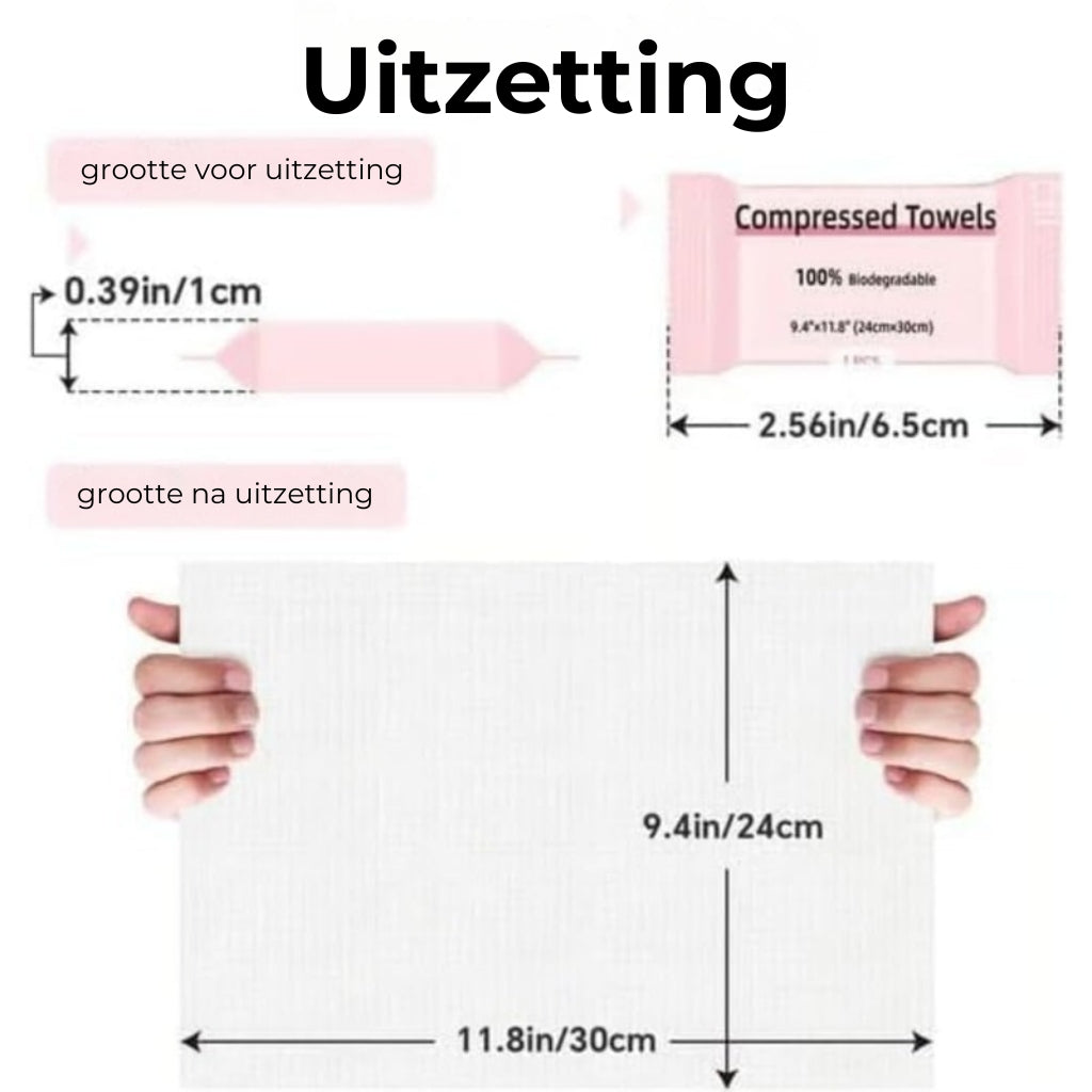 Compact in de tas en groots in gebruik Elke handdoek begint als een uiterst compact tabletje van 4 x 3 cm, waardoor ze moeiteloos in elke broekzak, handtas of dashboardkastje passen. Zodra er water wordt toegevoegd, groeit het tabletje binnen enkele seconden uit tot een volwaardige en zachte doek van 24 x 30 cm. Dankzij de individuele verpakking blijft elk exemplaar volledig hygiënisch en stofvrij tot het moment dat u het nodig heeft.